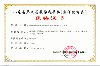 山东省第九届教学成果奖(高等教育类)二等奖(2022):“新媒体时代地方高校美育体系建构”