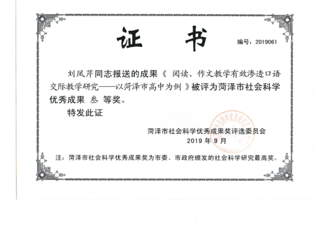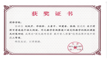 山东省教育厅“深化高考改革 提升育人质量”优秀成果三等奖(2021):“关于菏泽市普通高中语文阅读、作文教学有效渗透口语交际教学的现状调查及对策研究”