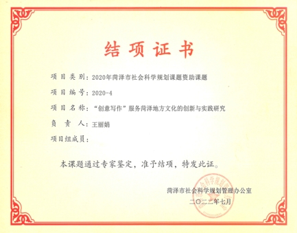 菏泽市社科联项目(2020-2022)“‘创意写作’服务菏泽地方文化的创新与实践研究”
