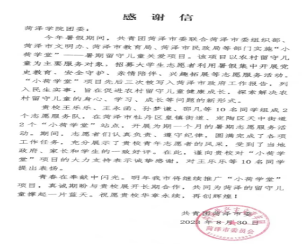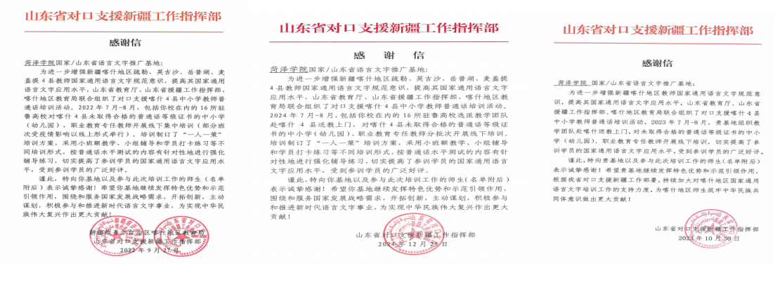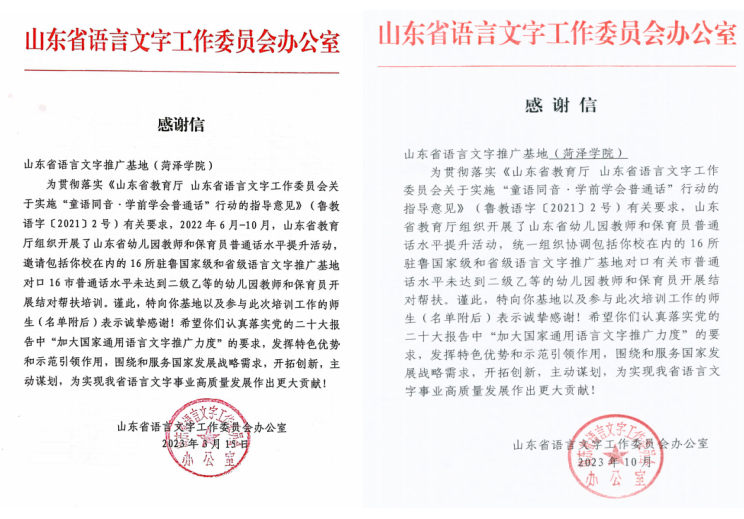 2022-2023年山东省语言文字工作委员会给菏泽学院语言文字推广基地的感谢信